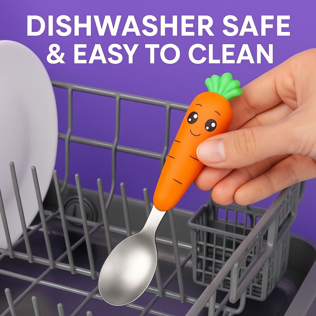 Our carrot-themed handles make kids excited to hold their spoon and fork and actually want to eat on their own.